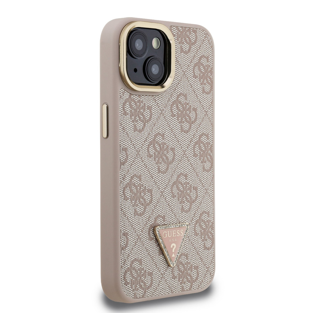 Guess PU 4G Strass Triangle Logo Stand Camera Frame MagSafe tok, iPhone 16 Pro - rózsaszín