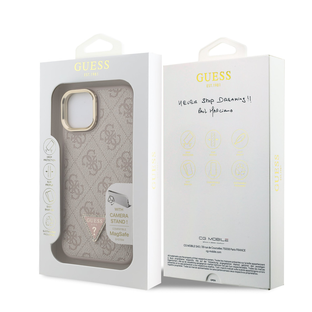 Guess PU 4G Strass Triangle Logo Stand Camera Frame MagSafe hátlap – Prémium védelem beépített állvánnyal