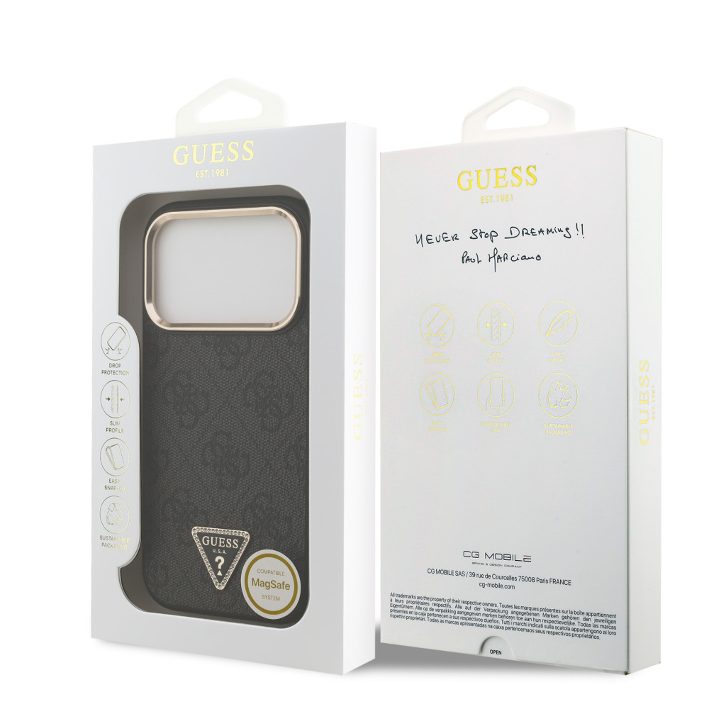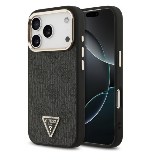 Guess PU Leather 4G Strass Triangle Logo arany Frame MagSafe tok, iPhone 17 Pro - fekete