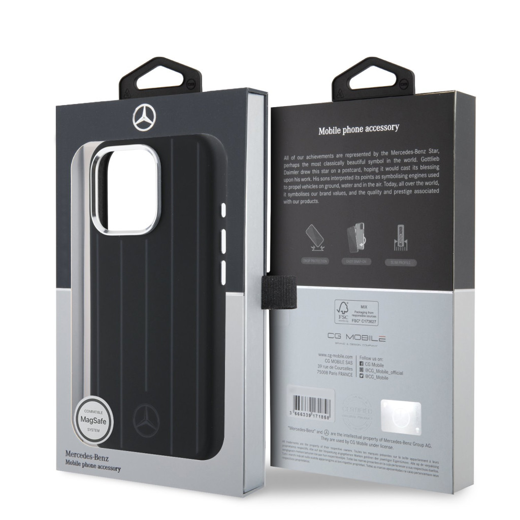 A Mercedes Liquid Silicone Stripes Pattern MagSafe tok a CG Mobile France által gyártott, hivatalosan licencelt Mercedes-Benz termék. A tok az Apple iPhone 16 Pro készülékre lett tervezve, minden gomb, port és kamera kivágása gyári pontossággal illeszkedik. Az anyaghasználat és kivitelezés megfelel a Mercedes márka által elvárt prémium standardoknak.