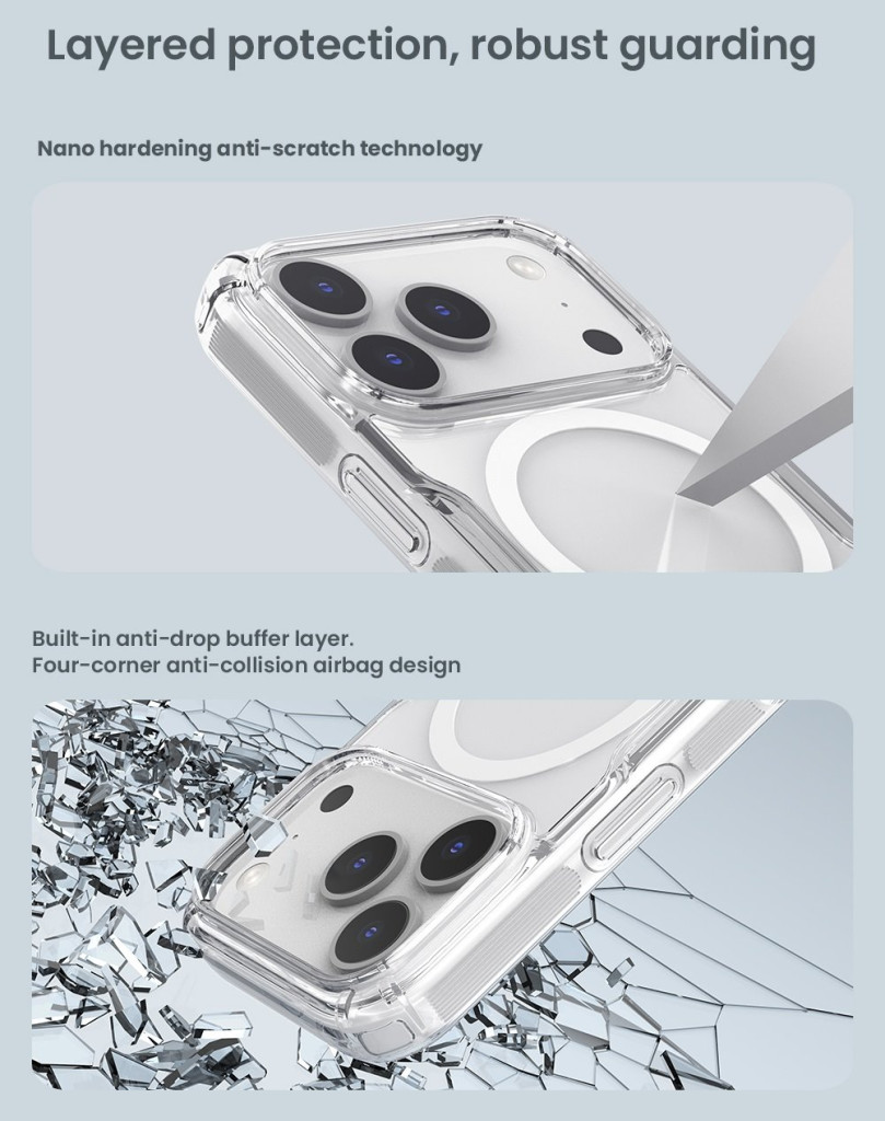A Nillkin Nature TPU PRO Magnetic sorozat kristálytiszta, sárgulásálló TPU anyaga hosszú távon is megőrzi eredeti megjelenését – nem sárgul, nem homályosodik el. A tok rugalmas kialakítása megkönnyíti a felhelyezést, miközben pontosan illeszkedik az Apple iPhone 17 Pro minden vonalára.
