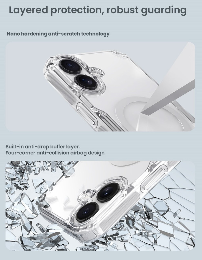 A Nillkin Nature TPU PRO Magnetic sorozat kristálytiszta, sárgulásálló TPU anyaga hosszú távon is megőrzi eredeti megjelenését – nem sárgul, nem homályosodik el. A tok rugalmas kialakítása megkönnyíti a felhelyezést, miközben pontosan illeszkedik az Apple iPhone 17 minden vonalára.