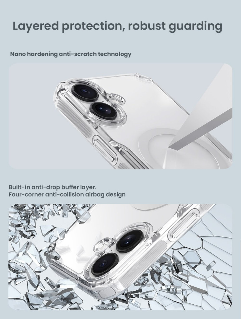 A Nillkin Nature TPU PRO Magnetic sorozat kristálytiszta, sárgulásálló TPU anyaga hosszú távon is megőrzi eredeti megjelenését – nem sárgul, nem homályosodik el. A tok rugalmas kialakítása megkönnyíti a felhelyezést, miközben pontosan illeszkedik az Apple iPhone 17 minden vonalára.