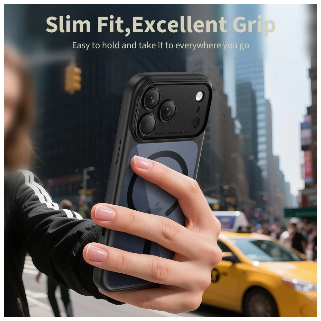 A Tech-Protect Magpeak a rugalmas TPU keret és a kemény, víztiszta polikarbonát hátlap ötvözete. Ez a hibrid kialakítás segít elnyelni a napi használat során fellépő rezgéseket és koccanásokat, miközben a megemelt peremek extra távolságot tartanak a kamera és a kijelző számára a sík felületektől.