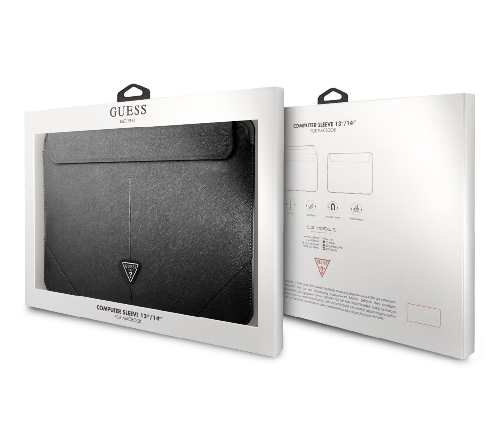 Fekete Saffiano PU bőr Guess laptop sleeve 13/14" mérethez – fém háromszög logóval. A Saffiano ráncminta luxusérzetet ad, a slim kialakítás praktikusságot.