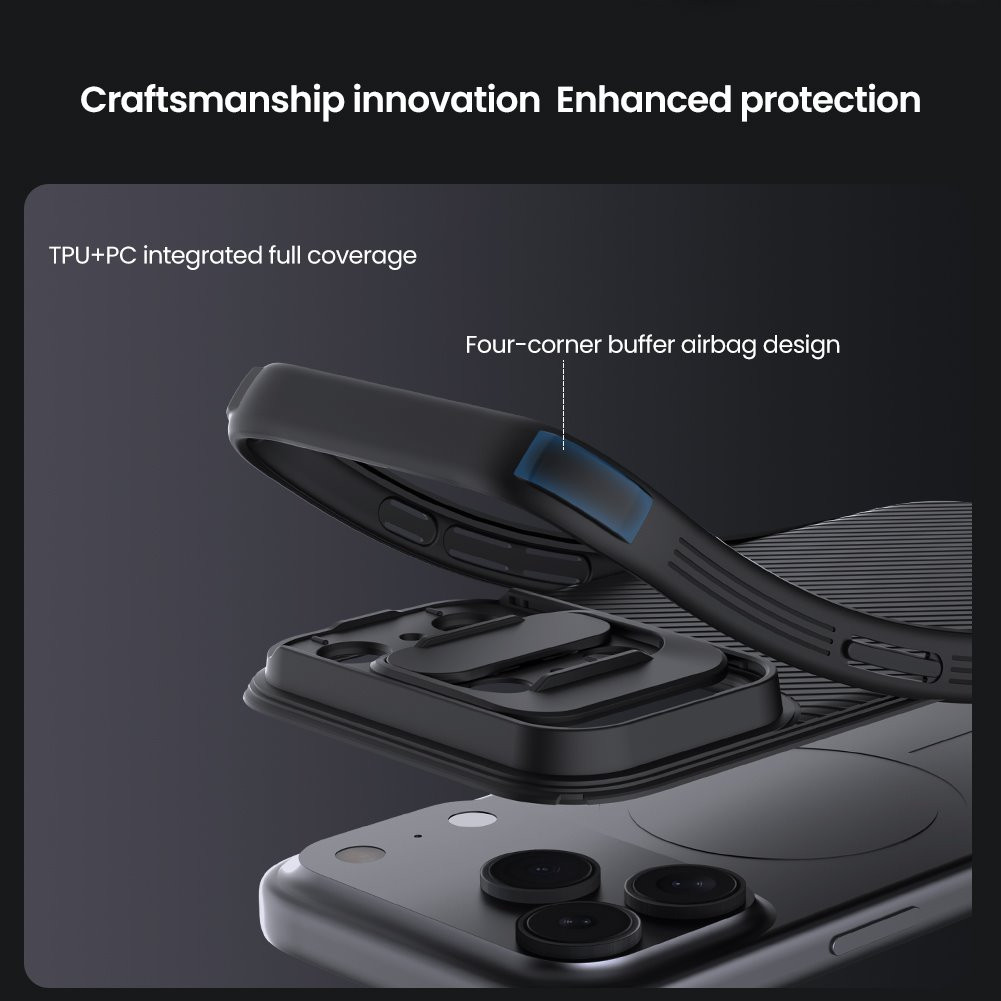 A Nillkin CamShield PRO Magnetic tok két anyag kombinációjával védi az iPhone 17 Pro készülékedet: kemény PC hátlap és rugalmas TPU keret gondoskodik arról, hogy minden esés után sértetlen maradjon a telefonod. A beépített csúsztatható kameravédő fedő megóvja a lencsét a karcolásoktól – akkor is, ha éppen a zsebedben van. MagSafe kompatibilis, Nem kell választani a dizájn és a védelem között.